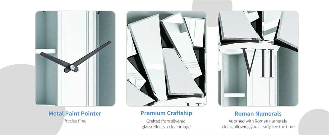 El lujoso reloj de pared con espejo utiliza MDF de 3,8 cm de espesor como marco y la periferia están decorados con un espejo de cristal. Todo el espejo es más lujoso y exquisito. Tiene un movimiento mecánico de precisión y funciona de forma silenciosa, lo que garantiza un sueño tranquilo durante toda la noche y crea un ambiente de trabajo tranquilo. La apariencia atractiva crea un punto focal en cualquier pared.